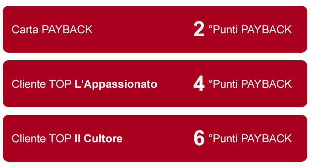 - °Punti x3 sui tuoi acquisti in libri attivabile da coupon su App o su sito PAYBACK. Accumulerai 6 °Punti invece di 2, per ogni euro speso.